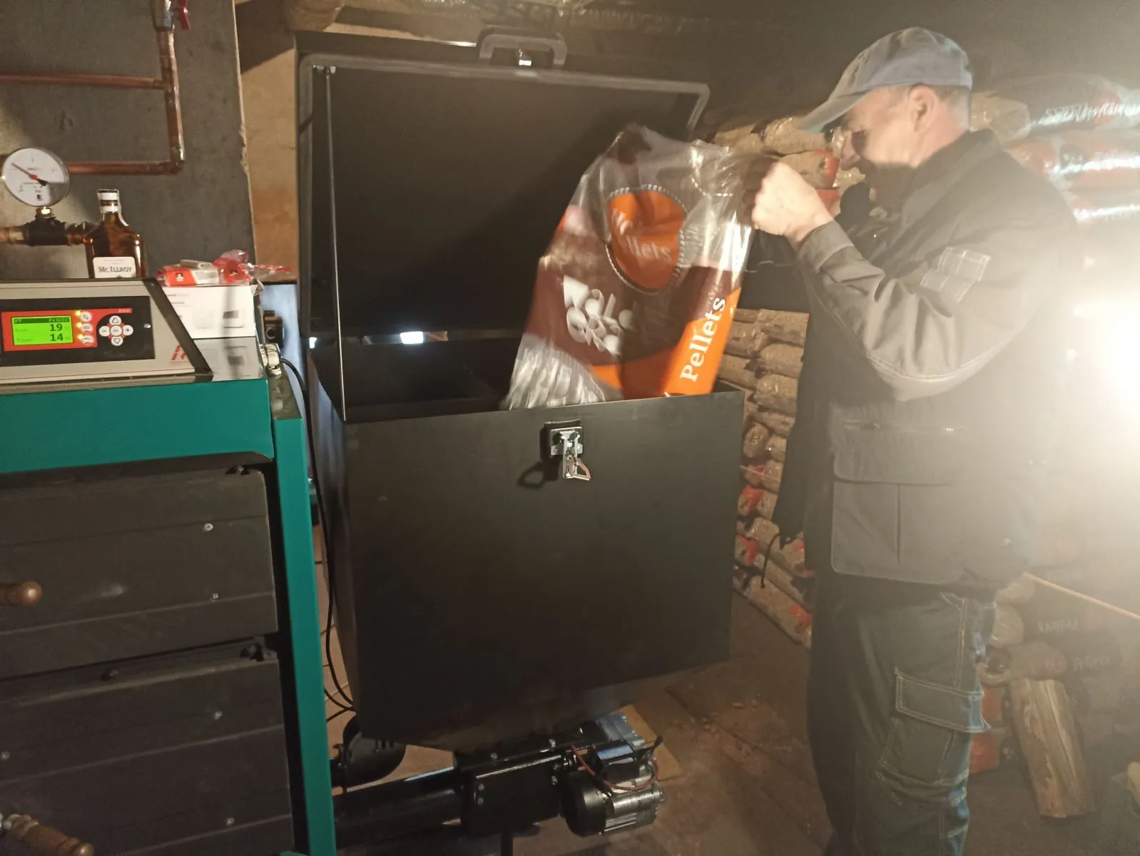 Odpoledne je instalace u konce, a my se jdeme přesvědčit, jak moc byla úspěšná. Naplníme zásobník, který pojme až 165 kg dřevních pelet.